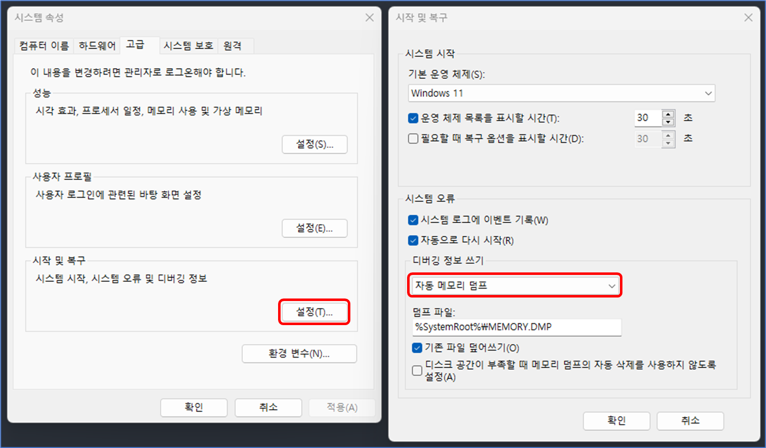 - CrashDumpEnabled REG_DWORD 0x3 = ์์ ๋ฉ๋ชจ๋ฆฌ ๋คํ(64KB)