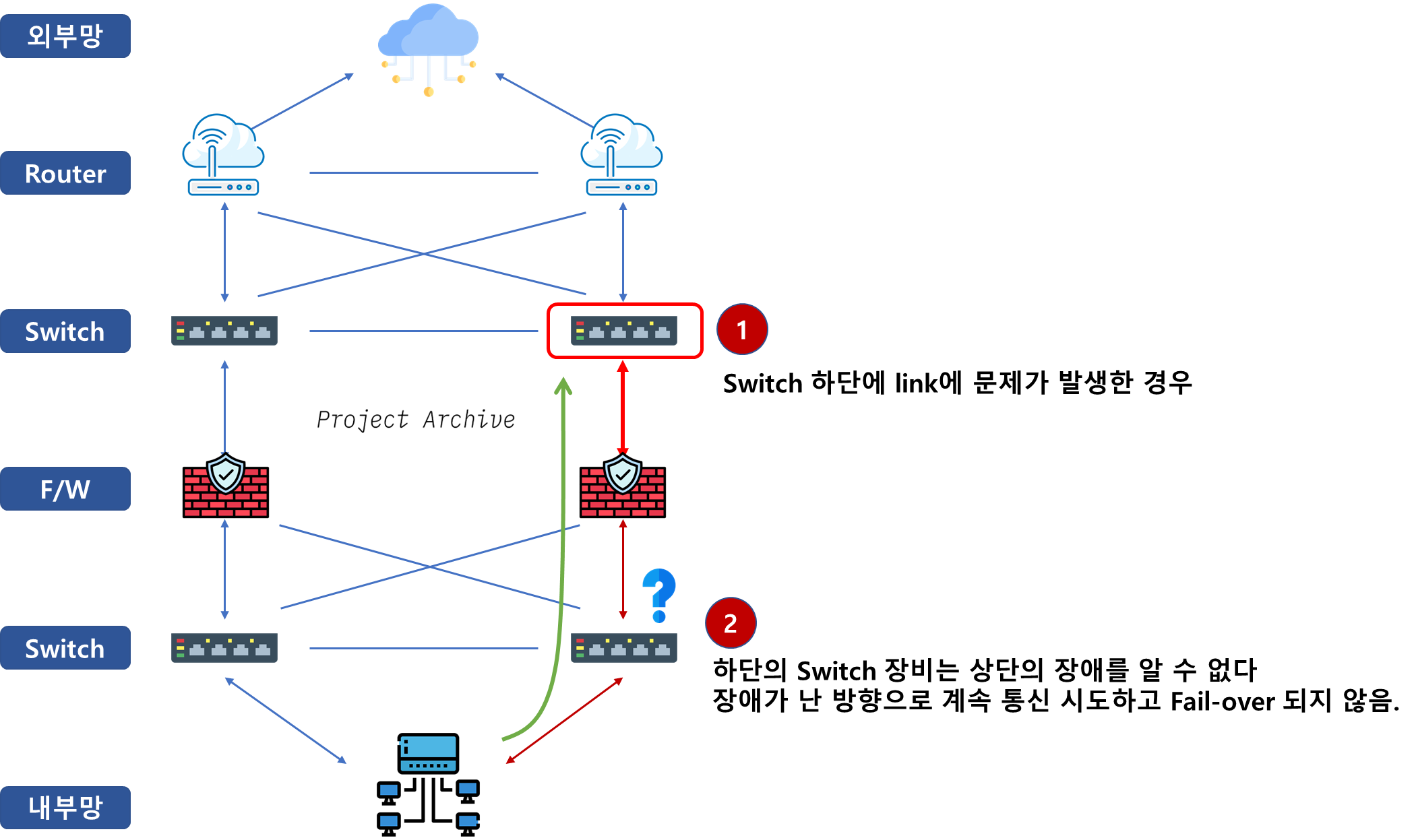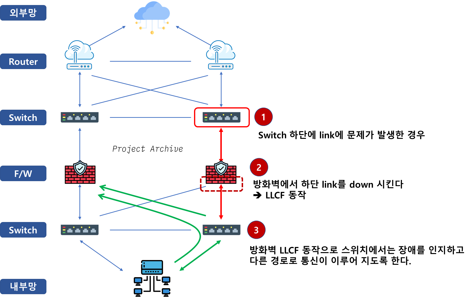 -- LLCF๊ฐ ์ค์ ๋ ์ฅ๋น ๊ธฐ์ค์ผ๋ก ์, ์๋ Link ์ค ํ๋๋ผ๋ ๋์ด์ง๋ฉด ๋๋จธ์ง Link๋ ๋์ด์ Fail-Over๊ฐ ๊ฐ๋ฅํ๋๋ก ํ๋ค.